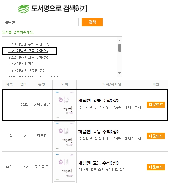 검색창에 [개념쎈] 정도로만 키워드를 잡아서 검색하셔도 우리가 원하는 도서를 쉽게 찾을 수 있는데요, 연도와 도서명을 정확히 확인한 후 이용하시기 바랍니다. [다운로드] 버튼을 눌러서 다운받을 수 있으며, 씽넘버를 등록하시면 자료를 보다 쉽게 다운받을 수 있습니다.