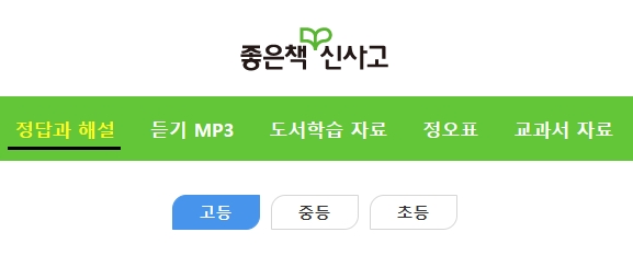 먼저 좋은책 신사고 홈페이지(나를 바꾸는 힘! 좋은책신사고 (sinsago.co.kr))에 접속하여 메인화면 중간 좌측쯤에 있는 [정답과 해설] 메뉴를 선택합니다. [학습자료실] 페이지에서 도서명으로 원하는 도서를 검색할 수 있습니다.