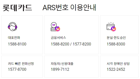 누르는 ARS는 1번 - 개인회원, 2번 - 가맹점회원, 3번 - 법인회원, 4번 - 카드신청/발급진행조회/카드사용등록, 5번 - 중도금대출/전세대출/비회원대출, 6번 - 우리은행 롯데카드 관련문의, 8번 - 분실문의/보이스피싱, 0번 - 비회원문의입니다.