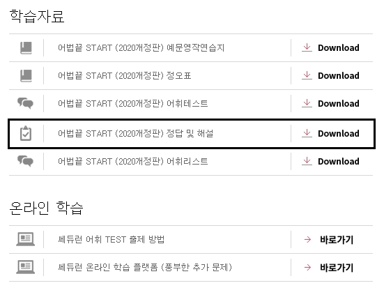 교재 상세페이지의 [학습자료] 카테고리에서 [어법끝 START 정답 및 해설] 항목을 확인하고 [Download] 버튼을 눌러서 PDF파일로 열 수 있습니다.