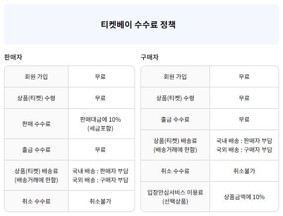 티켓베이 수수료는 위의 표를 참고하세요. 판매자와 구매자에 대하여 회원가입, 상품(티켓) 수령, 판매, 출금, 상품(티켓) 배송료, 취소, 입장안심서비스 이용료 등 수수료 정보가 안내되어 있습니다.