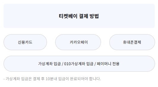 티켓베이 결제수단은 신용카드, 카카오페이, 휴대폰결제, 가상입금/010가상계좌입금/페이머니전용이 있습니다. 가상계좌 입금은 결제 후 10분 내에 입금이 완료되어야 합니다.