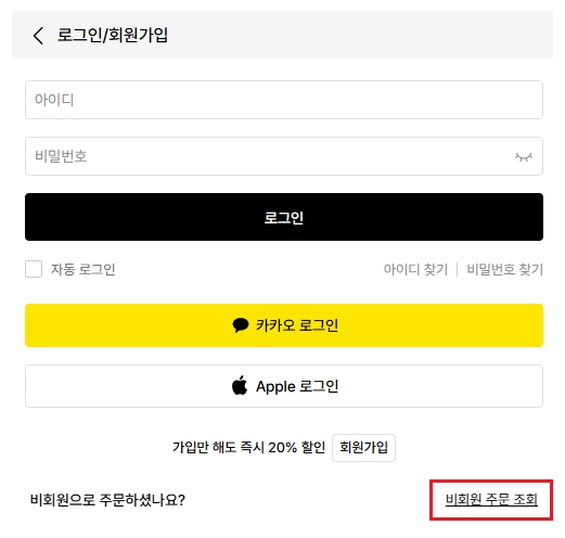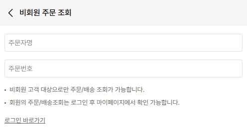 주문자명과 주문번호를 입력하시면 되는데요, 비회원 고객 대상으로만 주문/배송 조회가 가능하니 참고하세요. 회원의 주문/배송조회는 로그인 후 마이페이지에서 확인이 가능합니다.