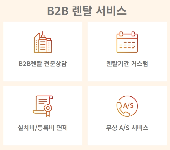 이용절차는 고객의 견적요청 > 견적검토 및 상담 후 견적서 제안 > 고객의 견적서 확인 및 계약 진행 > 계약 체결 및 렌탈서비스 시작 순입니다. 기업과 사업장 등 대량의 제품렌탈 및 구매가 필요한 곳에 만족도 높은 서비스를 제공한다고 하네요.