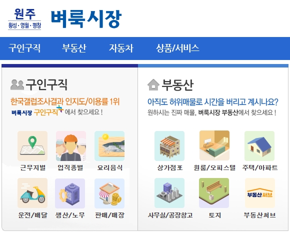 홈페이지(벼룩시장 - 좋은 사람들의 생활정보 시장 원주/횡성/영월/평창)에 접속하시면 구인구직, 부동산, 자동차, 상품/서비스 카테고리 열람이 가능합니다.