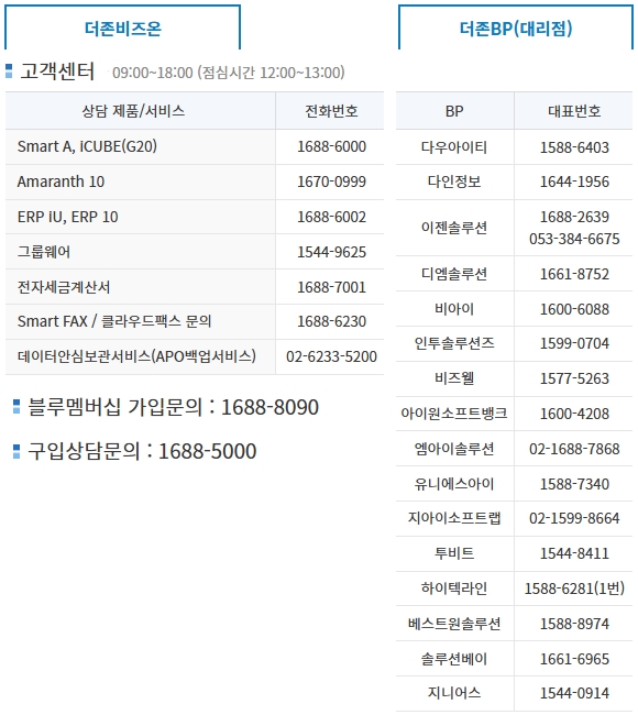 더존 온라인 고객센터 전화번호는 1688-6000번, 블루멤버십 전화번호는 1688-8090번, 구입상담문의 전화번호는 1688-5000번, 팩스번호는 02-6233-3030번입니다. 고객센터 운영시간은 09시부터 18시까지이고, 점심시간은 12시부터 13시까지입니다. 기타 상담/제품/서비스 관련 연락처와 더존BP(대리점) 연락처에 대해서는 위의 그림을 참고하세요.