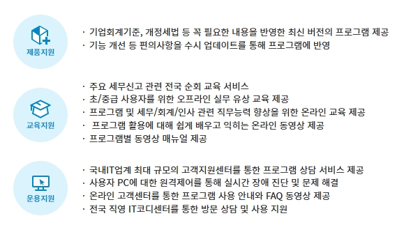 더존은 이러한 서비스를 지원하기 위하여 IT 업계에서 유일하게 전국적인 직영 세일 & 서비스 네트워크 인프라를 보유하고 있으며, 더존 솔루션에 대한 전문적인 지식을 바탕으로 통합 지원하는 IT코디네이터와 텔레컨설턴트로 구성된 조직을 통해 언제 어디서나 빠르고 편리한 고객서비스를 제공하고 있습니다.
