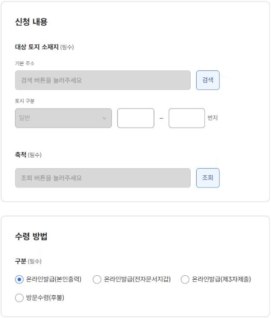 검색 버튼을 클릭하여 주소 검색창에서 동을 선택하고, 조회 버튼을 클릭하여 조회창에서 축척을 선택합니다. 그리고 수령방법을 선택해 주시면 됩니다. 만약, 수령방법이 방문수령(후불)인 경우에는 검색 버튼을 클릭하여 수령방법 검색창에서 수령방법을 선택합니다.