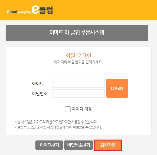 E-CLUB은 이마트의 자산으로, 인가된 사용자만 접근할 수 있습니다. 또한, 불법적인 접근 및 사용시 관계 법규에 따라 처벌받을 수 있으므로 정식 절차를 통하여 가입해야 합니다.