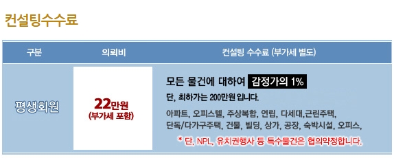 모든 고객은 모든 물건에 대하여 법정수수료 한도인 감정가의 1%가 컨설팅 수수료로 발생하며, 낙찰 성공시에만 청구되고 낙찰받지 못했을 때에는 청구되지 않습니다. 여의주경매는 일반고객과 VIP고객을 구분하지 않으며, 물건 종류에 따라서 컨설팅 수수료가 변동되지 않습니다.