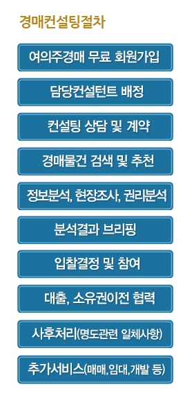절차는 여의주경매 무료 회원가입 > 담당 컨설턴트 배정 > 컨설팅 상담 및 계약 > 경매물건 검색 및 추천 > 정보분석/현장조사/권리분석 > 분석결과 브리핑 > 입찰결정 및 참여 > 대출/소유권이전 협력 > 사후처리(명도관련 일체사항) > 추가서비스 제공(매매/임대/개발 등) 순입니다.