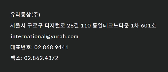 유라통상은 서울시 구로구 디지털로 26길 110 동일테크노타운 1차 601호에 위치하고 있으며, 홈페이지(유라통상㈜)도 운영하고 있으니 온라인으로도 접속해 보세요. 또한 대표번호는 02-868-9441번, 팩스번호는 02-862-4372번, 이메일주소는 international@yurah.com입니다.