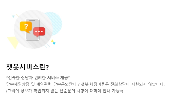 신속한 상담과 편리한 서비스 제공하고, 단순채팅 상담 및 계약관련 단순문의 안내를 받으실 수 있습니다. 챗봇/채팅 이용은 전화상담이 지원되지 않으며, 고객 정보가 확인되지 않는 단순문의 사항에 대하여 안내가 가능합니다.