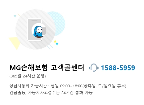 MG손해보험 고객콜센터 전화번호는 1588-5959번입니다. 상담사 통화 가능시간은 평일 09:00~18:00, 긴급출동 및 자동차사고접수는 24시간입니다.