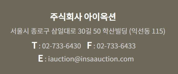 주식회사 아이옥션은 서울시 종로구 삼일대로 30길 50 학산빌딩(익선동 115)에 위치하고 있습니다. 문의사항이 있는 분들은 전화번호 02-733-6430번, 팩스번호 02-733-6433번, 이메일주소 iauction@insaauction.com으로 연락하시기 바랍니다.