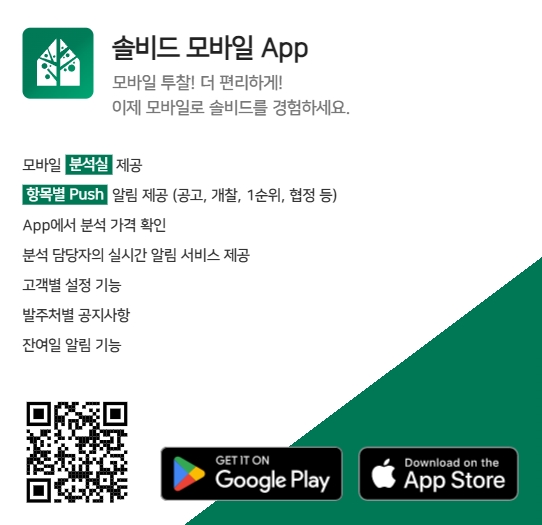 솔비드는 모바일에서도 만나보실 수 있으며, 제공하는 주요 서비스는 모바일 분석실 제공, 항목별 푸쉬알림 제공, 앱에서 분석가격 확인, 분석 담당자의 실시간 알림서비스, 고객별 설정기능, 발주처별 공지사항, 잔여일 알림 등입니다.