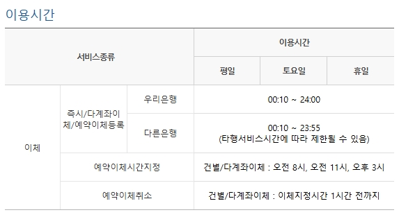이용가능 시간의 경우, 매일 00:00~00:10(금요일은 00:00~00:40)은 시스템 일자전환에 따라 서비스 이용이 제한되고, 시스템 상황에 따라 일자전환 및 중단시간이 변경될 수 있습니다.