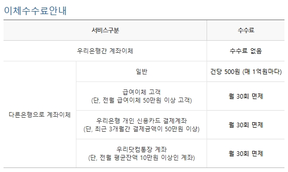 이체 수수료는 우리은행간 계좌이체 시 수수료가 없고, 다른은행으로 계좌이체 시 수수료에 대해서는 위의 표를 확인하세요. 우리, 경남, 광주은행간 자금이체 시에는 수수료가 면제됩니다.
