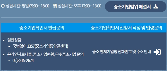 중소기업확인서 발급문의는 일반상담과 온라인자료제출, 중소기업현황, 우수중소기업문의를 하실 수 있습니다. 전화번호 정보는 위의 내용을 참고하시구요, 상담이 가능한 시간은 평일 09시부터 18시까지입니다. 점심시간은 12시부터 13시까지니까 나머지 시간대에 문의하시기 바랍니다.