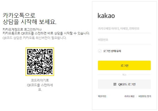 먼저 카카오톡 상담부터 보겠습니다. 카카오 계정으로 로그인하거나 QR코드를 스캔하여 바로 상담을 시작할 수 있습니다. 로그인 방식으로 할 경우 아이디와 비밀번호를 입력하여 [로그인] 버튼을 눌러주세요. 새롭게 회원가입을 하거나 계정 설정을 하거나 비밀번호 찾기를 할 수도 있습니다.