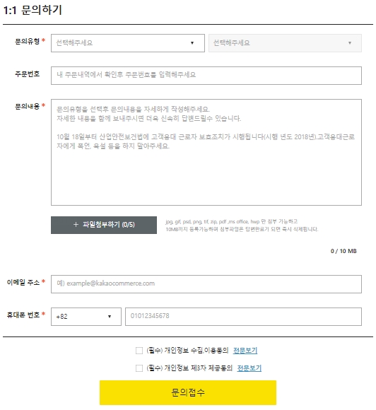 다음으로는 1:1문의하기를 이용해보겠습니다. 문의유형, 주문번호, 문의내용, 이메일주소, 휴대폰번호를 입력하고 이용약관에 동의 후 [문의접수] 버튼을 눌러서 접수하시면 되겠습니다. 오늘은 이처럼 카카오커머스 고객센터 이용하는 방법을 알아보았는데요, 말씀드렸던 것처럼 별로 어려운 부분이 없기때문에 여러분들도 필요할때마다 이용해보시기 바랍니다.