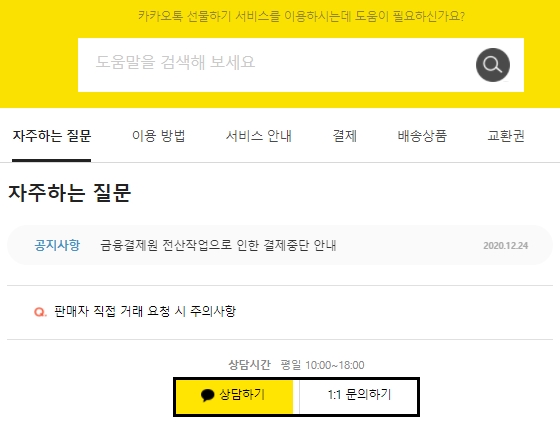 저는 소비자 입장에서 카카오톡 선물하기 항목을 선택하여 들어가보았습니다. 자주하는 질문, 이용 방법, 서비스 안내, 결제, 배송상품, 교환권, 기타 메뉴를 이용할 수 있으며 공지사항을 확인할수도 있습니다. 상담방법은 카카오톡 또는 일대일 문의하기가 가능한데요, 이용가능 시간은 평일 10시부터 18시까지입니다.