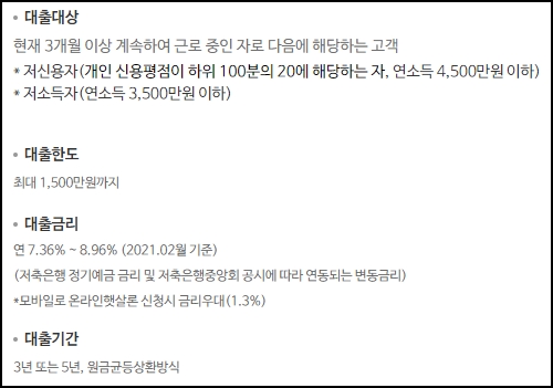 현재 3개월 이상 지속적으로 근로중인 사람을 대상으로 하며, 저신용자 및 저소득자 기준을 만족해야 합니다. 한도는 최대 1500만원까지로 높은편으 아닌데요, 그래도 필요한 분들께는 큰 도움이 될 수도 있습니다. 금리는 연 7.36%부터 8.96%까지이고, 기간은 3년 또는 5년으로 원금균등상환방식입니다.