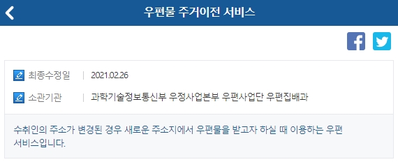 우정사업본부 우편사업단 우편집배과이며, 수취인의 주소가 변경된 경우 새로운 주소지에서 우편물을 받고자 할 때 이용하는 우편 서비스입니다.
