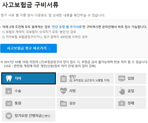 청구금액이 300만원 이하인 경우에는 진단 유형별 추가서류만 구비하여 온라인에서 바로 접수할 수 있습니다. 그럼 라이나생명 치아보험 청구서류를 알아보겠습니다.