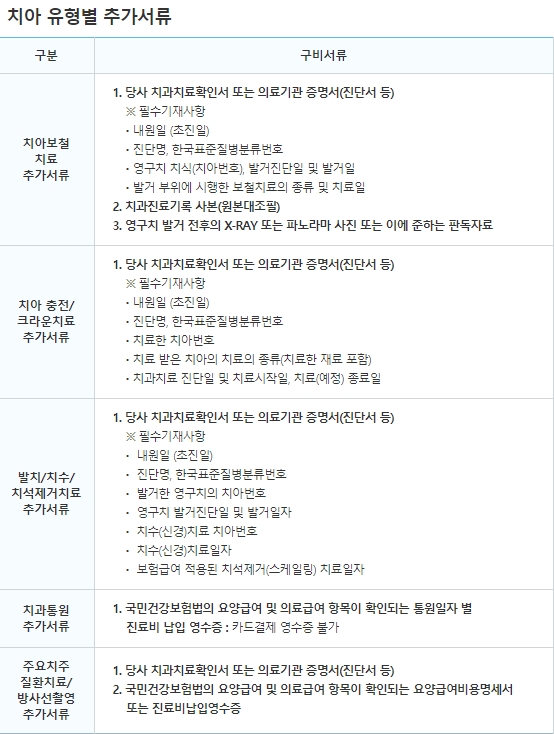 다음은 치아 유형별 추가서류를 보겠습니다. 치아보철 치료, 치아 충전, 크라운치료, 발치, 치수, 치석제거치료, 치과통원, 주요치주질환치료, 방사선촬영으로 구분되어 있으며 각각에 대한 추가서류는 위의 표를 참조하시기 바랍니다.