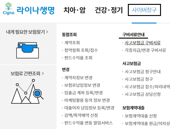 일단은 해당 보험사 홈페이지 주소를 찾아서 접속하도록 하겠습니다. 네이버나 다음, 구글 등을 활용하여 검색하시면 사이트 바로가기를 통할 수 있으며 메인화면의 모습은 위의 그림과 같습니다. 상단에 있는 [사이버창구] 메뉴를 눌러서 [구비서류안내] 영역에 있는 [사고보험금 구비서류] 항목을 눌러주세요.