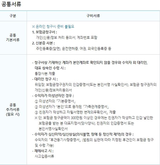먼저 공통서류입니다. 보험금 청구서와 신분증 사본이 있어야 하는데, 만약 온라인으로 청구할 경우에는 준비하지 않아도 된다고 하네요. 청구서상 기재한 계좌가 본인계좌로 확인되지 않을 경우, 수익자 외 대리인 및 대표 상속인 수령시, 대리인 청구시, 수익자가 미성년자인 경우, 수익자가 심신미약 및 심신상실의 경우, 재해사고시 추가서류를 요청할 수 있습니다.