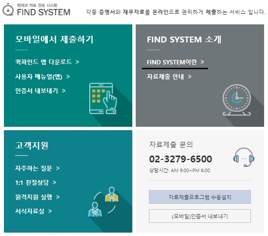 국세청 홈택스, 세무서에서 증명서를 발급하고 해당기관에 제출하는 절차를 온라인화하였으며 고객은 사무실에서 Find System을 이용하여 증명서를 발급 후 금융기관으로 실시간 전송을 할 수 있습니다. 그림으로도 설명하고 있으니, 위의 이미지를 같이 참고하시면 좋을 것 같습니다.