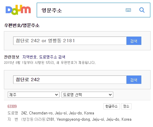 두번째로 Daum에서 제공하는 서비스를 보겠습니다. 좀전과 마찬가지로 키워드를 잡고 검색하시면 우편번호/영문주소 서비스를 이용할 수 있습니다. 지난 2015년 8월 1일부터 시행된 5자리 새 우편번호가 제공된다고 하네요. 예시에 나와있는 첨단로 242를 입력하여 결과를 확인해보았는데요, 도로명과 지번에 대하여 영문주소를 보여줍니다.