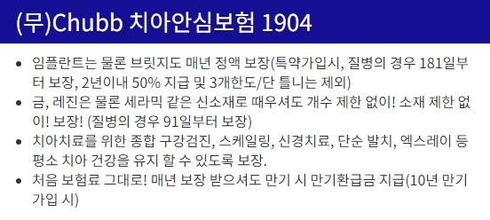 치아안심보험의 경우 임플란트, 틀니, 브릿지와 같은 보철치료를 매년 정액 보장하며 금이나 레진 및 세라믹과 같은 신소재로 때워도 개수나 소재에 제한없이 보장합니다.