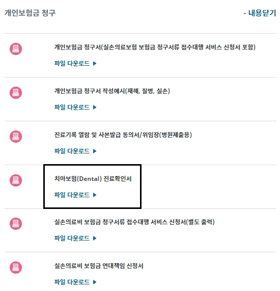 개인보험금 청구내용을 열어보시면 상세 서류들을 확인할 수 있는데요 청구서, 진료기록 열람 및 사본발급 동의서/위임장, 치아보험 진료확인서, 실손의료비 보험금 청구서류 접수대행 서비스 신청서, 실손의료비 보험금 연대책임 신청서 등 다양한 서류들이 있기때문에 필요한 양식을 선택하여 [파일 다운로드] 버튼을 누르시면 됩니다.