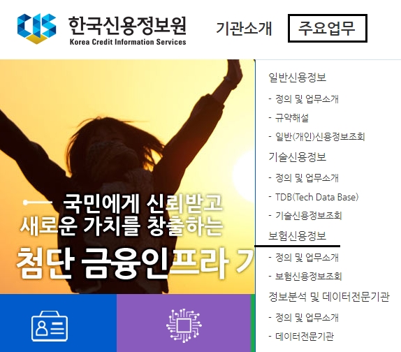 오늘은 한국신용평가정보원 홈페이지에 접속해서 보험신용정보에 대하여 알아보려고 하는데요, 메인화면 상단의 [주요업무] 메뉴를 선택하시면 확인할 수 있습니다.