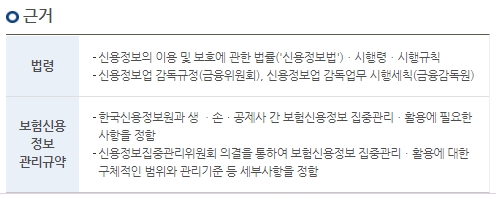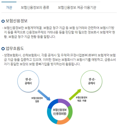 생명보험사, 손해보험사, 각종 공제사 및 우체국으로부터 보험계약이나 보험금지급 등에 집중하고 있으며 이러한 정보는 보험회사가 보험사기를 예방하고 금융소비자가 동일한 보장의 보험에 중복가입하는것을 방지하는데 활용됩니다. 근거를 보시면 법령에 신용정보의 이용 및 보호에 관한 법률, 시행령, 시행규칙이 있고 신용정보업 감독규정과 신용정보업 감독업무 시행세칙이 있습니다.