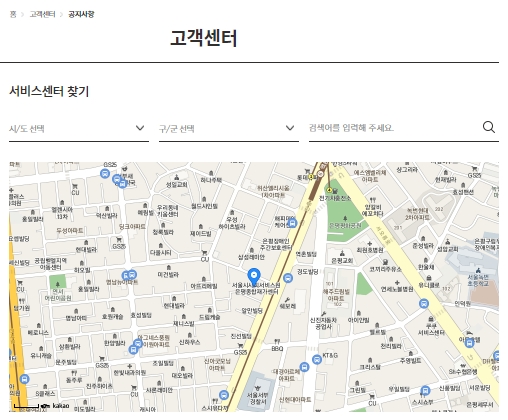 또한 쿠쿠에서 구매하신 제품등록하고 무상으로 A/S를 받을수도 있습니다. 다음은 서비스센터 찾기를 보겠습니다. 지역을 선택하거나 검색어를 입력하여 찾아볼 수 있는데요, 해당 센터에 대하여 많은 정보가 나와있지는 않기때문에 일단 전화를 걸어서 문의해보는 것이 좋을거라고 생각합니다.