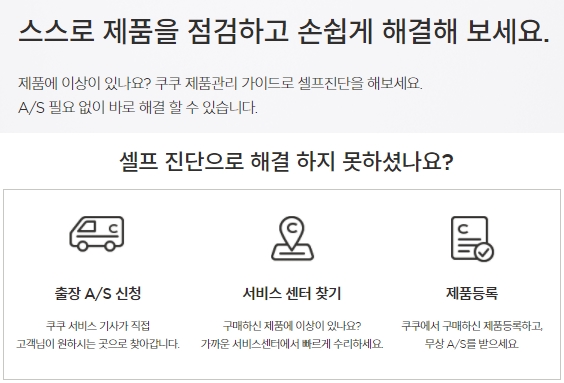 스스로 제품을 점검하고 손쉽게 해결할수도 있는데요, 제품에 이상이 있는경우 쿠쿠 제품관리 가이드로 셀프진단을 해보시기 바랍니다. A/S 없이도 해결이 가능한 경우가 있습니다. 만약 셀프진단으로 해결하지 못했다면
