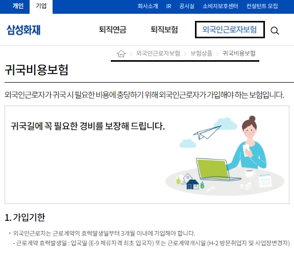 귀국비용보험은 외국인근로자가 귀국시 필요한 비용에 충당하기 위하여 외국인근로자가 가입해야 하는 보험입니다. 귀국길에 필요한 경비를 보장해드리는데요, 외국인근로자는 근로계약의 효력발생일부터 3개월 이내에 가입해야 합니다. 근로계약 효력발생일은 입국일 또는 근로계약개시일입니다.
