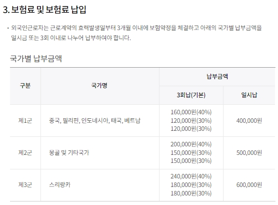 외국인근로자는 근로계약의 효력발생일로부터 3개월 이내에 보험약정을 체결하고 위의 표와같이 국가별 납부금액을 일시금 또는 3회 이내로 나누어 납부해야 합니다. 국가별 납부금액표는 구분, 국가명, 납부금액으로 안내하고 있으니 참고하시기 바랍니다.