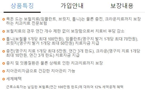 충치나 잇몸질환은 물론이고 상해로 인한 치과치료까지 보장하며, 치아관리자금으로 건강하게 치아관리가 가능하고, 근로소득자는 납입한 보험료에 대해서 연간 100만원 한도로 12% 세액공제 혜택이 있습니다.