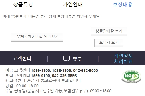 보장내용은 우체국치아보험 약관, 상품안내장, 요약서에서 확인하실 수 있습니다. 더 궁금한 사항이 있으시면 예금 및 보험 고객센터로 연락하시면 되는데요, 고객센터 연결시 통화요금이 부과됩니다. 운영시간은 평일 09시~18시까지이고, 주말과 공휴일에는 분실/사고접수만 가능하며 09시~18시까지 운영합니다.