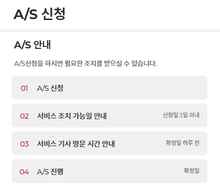 A/S 신청을 하시면 필요한 조치를 받으실 수 있으며, 절차는 다음과 같습니다.
