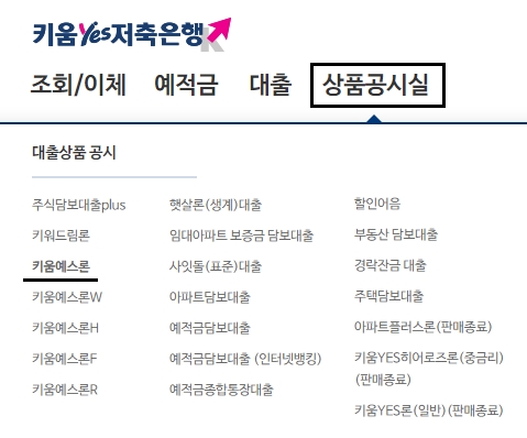 홈페이지에 접속하여 [상품공시실] 메뉴를 선택하시면, 제공하는 여러가지 대출상품들을 확인할 수 있습니다. 키움예스론에도 종류가 다양하게 있고, 담보대출 및 현재 판매종료인 상품들도 있으니 참고하시기 바랍니다.