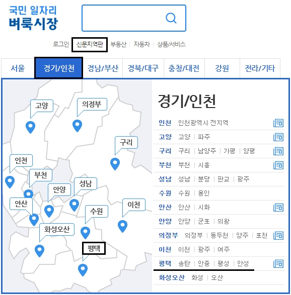 페이지가 새롭게 뜨면 [경기/인천] 탭을 선택하여, 지도상에서 [평택] 지역을 선택해주세요. 그러면 다시 페이지가 새롭게 뜨고 [벼룩시장 신문보기] 메뉴를 확인할 수 있습니다.