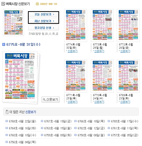 [오늘 신문보기] 또는 [지난 신문보기] 항목을 눌러서 원하는 날짜의 신문을 볼 수 있어요. 벼룩시장 신문은 주 5회 발행되고, 월요일부터 금요일까지입니다.