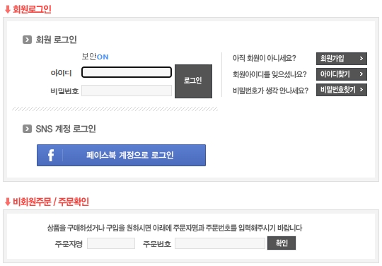 마지막으로는 주문조회 방법을 보겠습니다. 계정이 있으시면 아이디와 비밀번호를 입력하여 회원으로 로그인 후 이용하거나, SNS 계정으로 로그인 할 수 있습니다. 비회원주문 및 주문확인은 주문자명과 주문번호를 입력하여 조회할 수 있어요. 상품을 구매했거나 구입을 원하시면 해당 정보를 입력하여 조회해보세요.