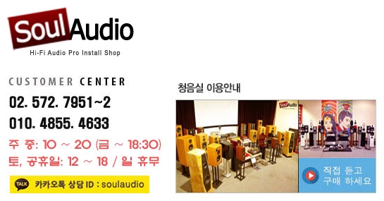 Soul Audio 또는 쏘울오디오는 지난 2007년에 오픈하여, 음향이 아닌 음악을 전해드리기 위하여 타협하지 않는 양심을 지키고자 하는 모토로 유저에 맞춘 최적의 시스템 제안과 차별화된 프로 인스톨을 바탕으로 동 가격대 최상의 하이파이 오디오 시스템 및 AV 시스템을 수백차례 구축한 진정한 프로 인스톨 샵이라고 합니다.
